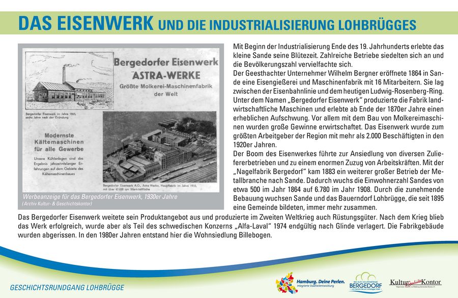 Der Geesthachter Unternehmer Wilhelm Bergner eröffnete 1864 in Sande eine Eisengießerei und Maschinenfabrik mit 16 Mitarbeitern. Sie lag zwischen der Eisenbahnlinie und dem heutigen Ludwig-Rosenberg-Ring. Unter dem Namen „Bergedorfer Eisenwerk“ produzierte die Fabrik landwirtschaftliche Maschinen und erlebte ab Ende der 1870er Jahre einen erheblichen Aufschwung. Vor allem mit dem Bau von Molkereimaschinen wurden große Gewinne erwirtschaftet. Das Eisenwerk wurde zum größten Arbeitgeber der Region mit mehr als 2.000 Beschäftigten in den 1920er Jahren.